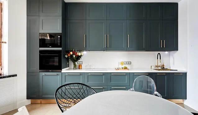 Высокие шкафы, достигающие потолка, обладают повышенной вместительностью и позволяют сэкономить место в самом небольшом пространстве. Подобные решения – идеальный вариант, когда хозяева обладают большим количеством кухонной утвари и техники, но располагают достаточно скромной площадью для хранения этих вещей. С вертикальными шкафами не придется задействовать антресоли гостиной или прихожей, все уместится на кухне. На самых верхних полках можно расположить банки для заготовок, праздничный текстиль и другие предметы, которые используются крайне редко. А в остальных системах хранения уместить все, что требуется ежедневно.
