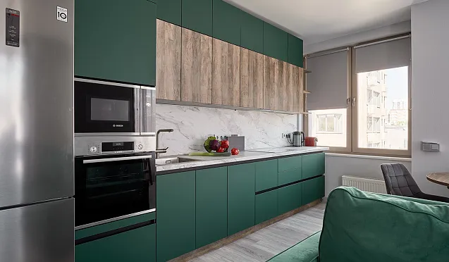 Бытовую технику лучше спрятать за фасадами встроенных шкафов. Благодаря этому приему кухонное помещение визуально будет выглядеть более просторным и свободным.