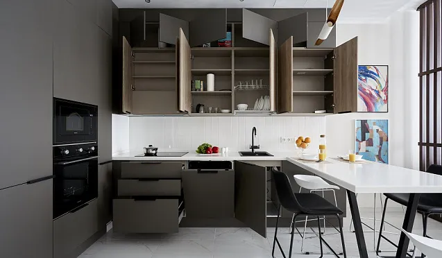 Для использования каждого сантиметра кухонного пространства с пользой рекомендуется использовать угловые шкафы. В свободных углах устанавливают секции для посуды, оснащенные вращающимися полками и выдвижными механизмами. Это позволяет сэкономить место и обеспечивает удобный доступ к содержимому.