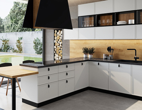 • Широкий ассортимент. В белом цвете производят угловые, линейные, П-образные, островные и полуостровные модели, а также версии с барными стойками.
