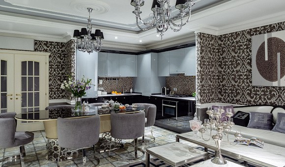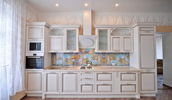 Неоклассические кухни в бежевых тонах выглядят особенно воздушно. С их помощью можно создавать стильные интерьеры, чем охотно пользуются многие дизайнеры. Для кухни в стиле неоклассики характерно использование лаконичного декора в виде вставок из стекла или металла. Также в качестве декоративного оформления применяются точечные светильники и светодиодные ленты. Их устанавливают для подсветки полок и рабочих поверхностей.