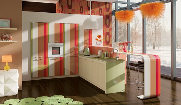 Интересно смотрятся фасады цвета беж в тандеме с зелеными элементами. В просторных помещениях с хорошим дневным освещением будет хорошо смотреться светлый комплект изумрудными и малахитовыми вставками. Для небольших комнат желательно выбрать салатовые, мятные и другие более светлые оттенки.