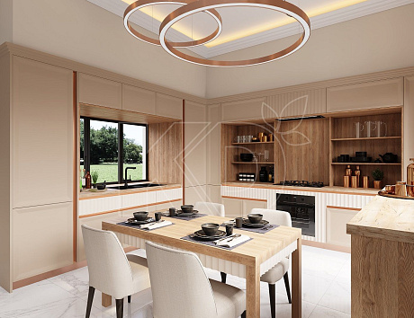 • Дизайн кухни в бежевых тонах придает помещению теплоту, если оно располагается на северной стороне, прекрасно компенсируя недостаток света;