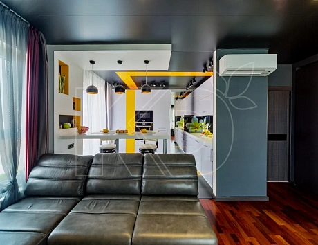 Это один из самых популярных и простых способов визуально разделить кухню и гостиную. Он хорош тем, что конструкция выполняет несколько функций: заменяет обеденный стол и подходит для быстрых перекусов, предоставляет дополнительные места для хранения принадлежностей. Чтобы барная стойка красиво смотрелась, ее стоит выполнить из того же материала, что и кухонные фасады.