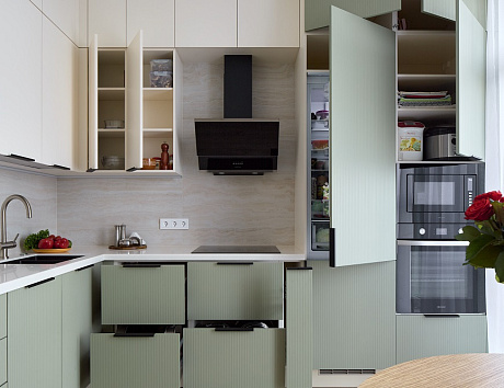 Такая мебель подходит как для больших помещений, так и для кухонь маленьких размеров, помогая использовать каждый сантиметр полезной площади.