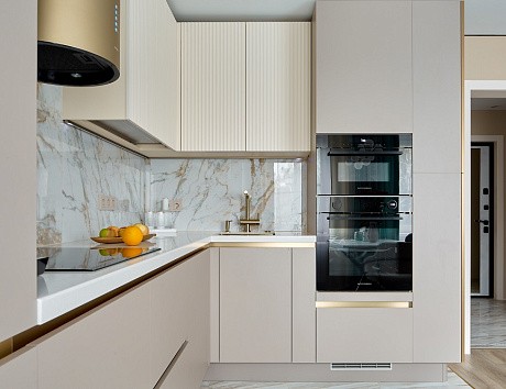 • Возможность учесть особенности помещения. Даже если у вас маленькая кухня или необычная планировка, дизайнеры найдут решение: они помогут с размерами прямой кухни и даже сложных П-образных вариантов.