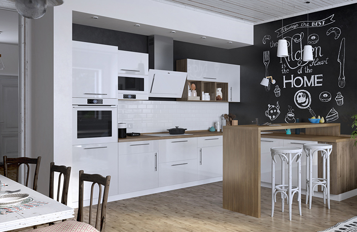 Хотите визуально расширить пространство и сделать помещение более свободным? В таком случае вам необходим кухонный гарнитур светлого оттенка, например, белоснежный. Дополнительно усилить эффект поможет сверкающее глянцевое покрытие мебели. Такие фасады отражают свет, наподобие зеркал, а значит, ваша кухня будет выглядеть еще больше.