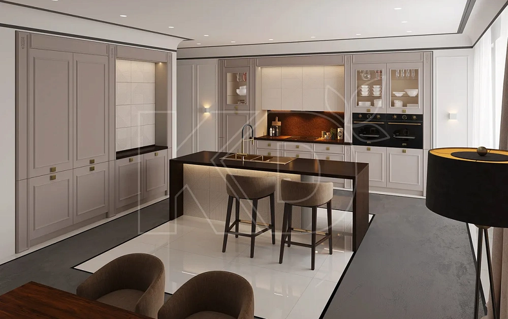 Неоклассика – еще одно направление, которое используется при оформлении кухонных интерьеров в 2023 году. Для этого стиля характерно сочетание современных деталей с классическим дизайном. Так, прямые строгие фасады, благородные спокойные оттенки комбинируются с продуманными системами хранения.