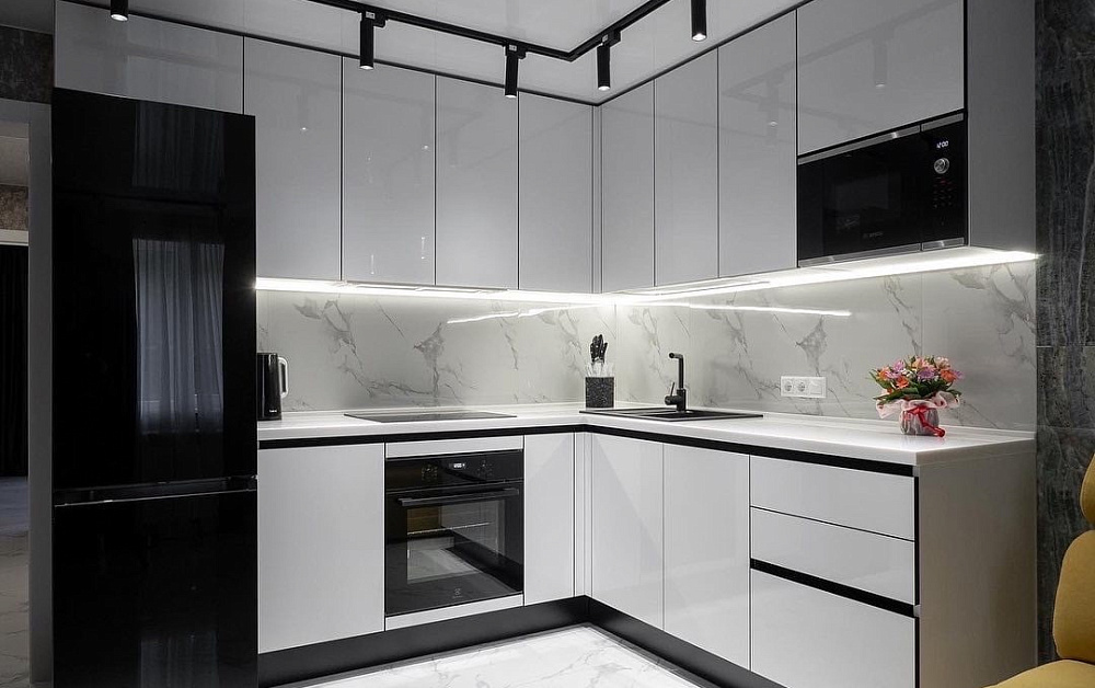 Угловая конфигурация – идеальное решение для небольших и средних комнат. При такой планировке шкафы размещают вдоль двух смежных стен. Особое внимание уделяют соблюдению рабочего треугольника, при котором плита, мойка и холодильник размещаются на одинаковом расстоянии друг от друга.