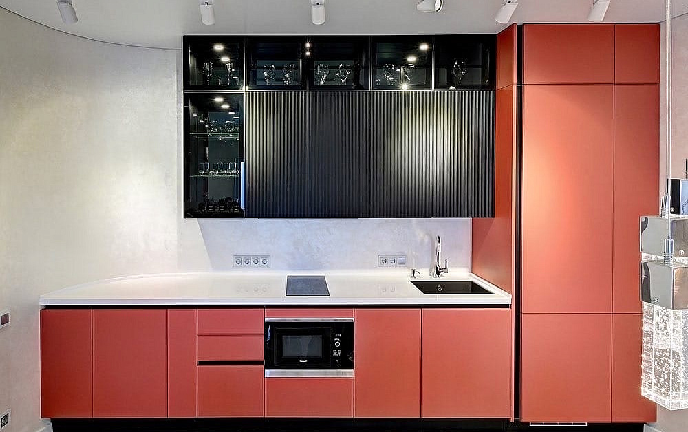 Еще один секрет от дизайнеров кухонной мебели – разделение бытовой техники на холодную и горячую. В первую категорию входят посудомойка и стиральная машина. Группа горячих приборов включает микроволновку, тостер, электрочайник и кухонную плиту. Благодаря такой расстановке обеспечивается комфортность пользования техникой и увеличивается срок ее эксплуатации.