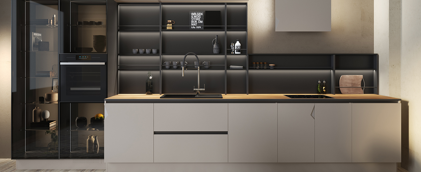 Холодильники, посудомоечные машины и вытяжки можно спрятать за фасадами. Они словно растворяются за аккуратными фасадами, оставляя пространство чистым и цельным. Кухня выглядит стильной и упорядоченной, а техника при этом остаётся полностью функциональной и под рукой, не нарушая общую эстетику.