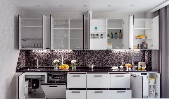 Широкий ассортимент. «Кухонный двор» предлагает разные варианты глянцевых кухонь. Вы можете выбрать комплект с навесными шкафами или открытыми полками, островным конструкциями или барными стойками.