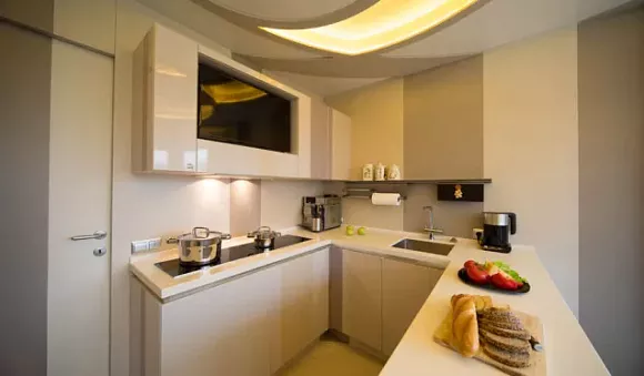 Версии в духе минимализма легко узнать по абсолютно гладким фасадам, часто с утопленными ручками. Бытовая техника обычно встроенная, шкафы отличаются функциональностью и строгими формами.