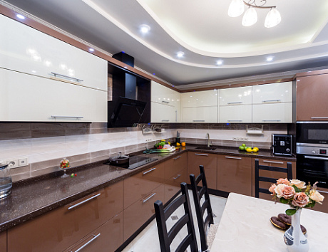 • Широкий ассортимент. В глянце выпускают линейные, угловые, П-образные, островные, параллельные модели.