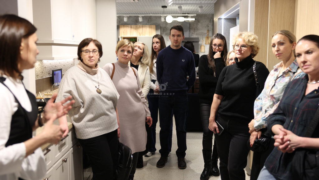 После официальной части гости отправились на экскурсию. Мы провели гостей по трём разным маршрутам, раскрывая особенности каждой зоны. Дизайнеры и менеджеры салона показали: