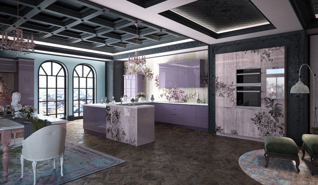Яркие фиолетовые кухни декорируют изображениями в серых, черных и бежевых тонах. Не следует использовать кричащие оттенки. В противном случае оформление будет выглядеть перегружено.