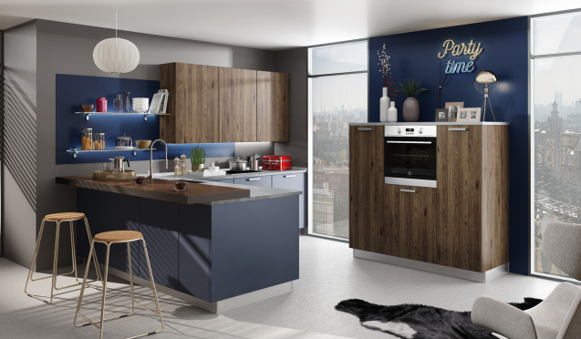 Кухни с полуостровом. В этом случае остров примыкает к остальной мебели, которая обычно располагается линейно или Г-образно. Полуостров используется для подготовки продуктов или в качестве обеденной зоны. Подобные гарнитуры можно интегрировать в любые комнаты. Для небольших обычно выбирают версии со складным полуостровом, который убирается после готовки или приема пищи.