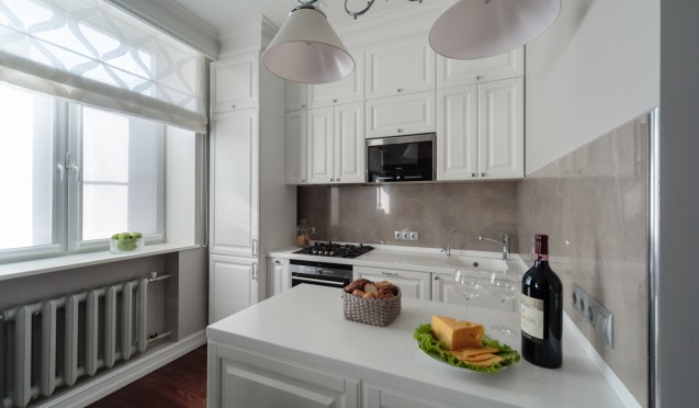 Линейные модели подходят для небольших пространств, так как не занимают много места. В таких комплектах мойку лучше разместить в самом центре. Варочную плиту и холодильник желательно расставить по краям, но не вплотную к раковине.