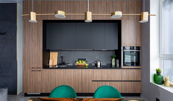 Линейные версии не займут много места, вместят всю кухонную утварь и бытовую технику. При этом желательно отказаться от верхнего ряда шкафов, используя вместо них открытые полки. Благодаря этому в комнате сохранится воздушность, не возникнет ощущения перегруженности и затененности.