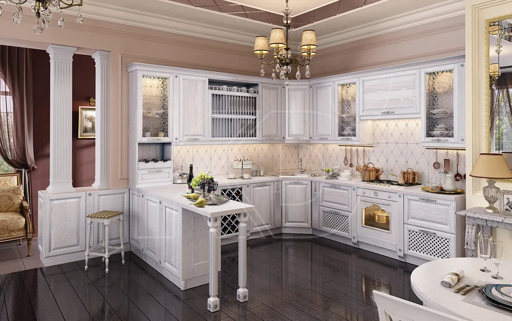 Классическая кухня отличается элегантностью, изяществом и роскошью. Подобные решения подходят для просторных помещений с высокими потолками и большими окнами. В небольших комнатах кухонная мебель в стиле классика будет смотреться несколько нелепо и вычурно из-за того, что для ее оформления используется роскошный декор – позолоченные элементы, лепнина, резьба, патина, изогнутые ручки.