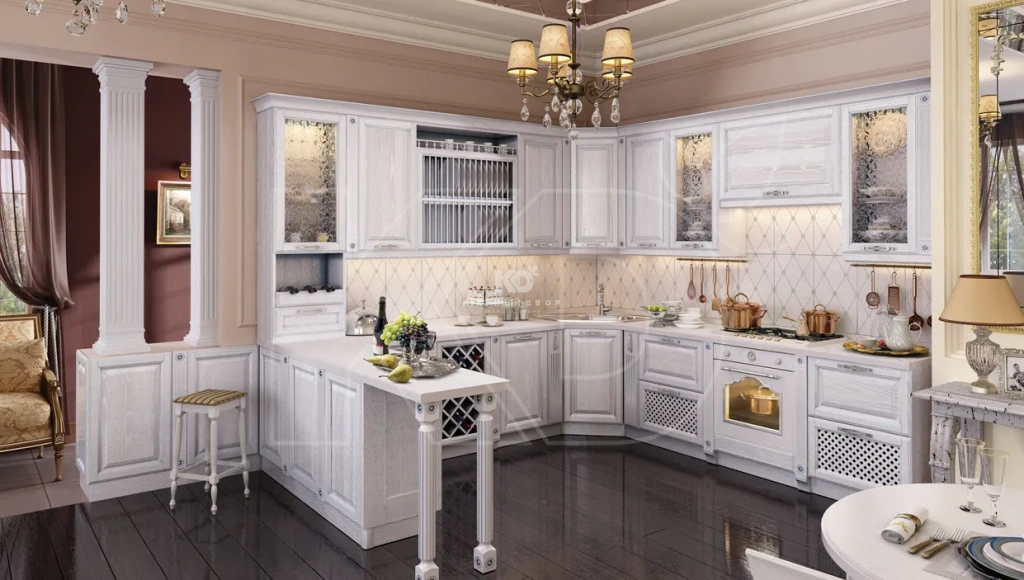 Для производства классических гарнитуров применяются качественные материалы. Фасады выполняют из натуральной древесины бука, ясеня или дуба. Более доступный вариант – качественный МДФ высокой прочности. Для производства столешниц используется натуральный и искусственный камень.
