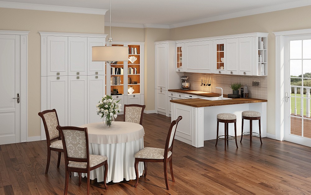 Белый гарнитур может иметь любую планировку, поэтому нужный вариант найдется для любой площади. Для большой комнаты или квартиры-студии подойдет островная модель. С ее помощью можно зонировать пространство. Конструкция в виде острова, совмещает в себе столешницу с варочной панелью и мойкой, иногда и с дополнительными ящиками.