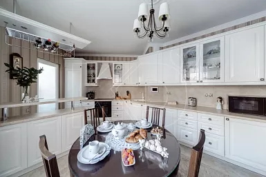 Облицовочные материалы для кухонных стен можно подобрать в любом строительном магазине. Современные производители предлагают разнообразные варианты отделки – влагоустойчивые и жидкие обои, моющуюся краску, стеклообои. Повышенной популярностью пользуется керамическая плитка. Ее используют для отделки фартука и целых стен. Недорогой, но практичный вариант – пластиковые панели. Они легко отмываются от загрязнений, не деформируются и не разбухают от влаги. Для оформления стен в классических интерьерах часто используют натуральные материалы – камень, дерево, мозаики из травертина.