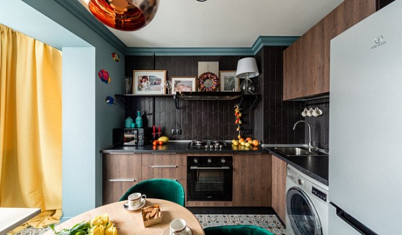 Для комнаты на северной стороне используйте более яркие акценты и вставки. Так, поверхности кухни коричневых цветов можно разбавить желтыми, алыми или оранжевыми оттенками. Такая комбинация внесет в пространство немного тепла и будет смотреться позитивно и интересно.