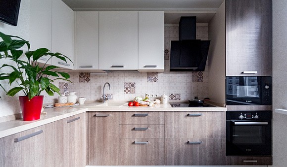 Кухни коричневого цвета привлекательно смотрятся как в однотонном, так и в комбинированном виде. Например, для небольшого помещения основной тон можно разбавить бежевыми, молочными или песочными вставками. При этом более светлый оттенок следует использовать для фасадов верхних шкафов.