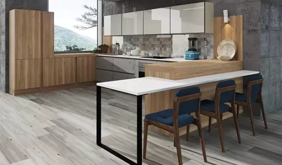 Компания «Кухонный двор» реализует мебель из дуба, бука, ясеня и МДФ. Вся продукция изготавливается из экологически чистого сырья, имеющего сертификаты соответствия. К другим преимуществам наших гарнитуров можно отнести следующие показатели: