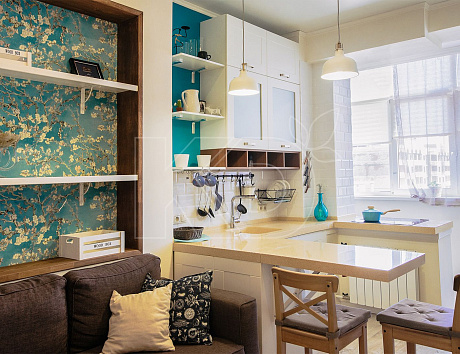 Чтобы выбранная модель максимально гармонично встроилась в интерьер, продумайте дизайн кухонного помещения. Он не должен конфликтовать с концепцией гарнитура. Кухня прованс с барной стойкой не потерпит яркого фона, поэтому откажитесь от идеи декорировать стены обоями с аляповатыми рисунками. Подходящий вариант – полностью однотонные поверхности или с декором в виде мелких растительных узоров.