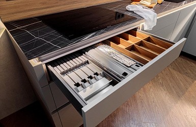 Если же вы выбрали современный стиль кухни, то мебель обойдется дешевле. При ее создании используются более доступные материалы, такие как искусственный камень и МДФ.