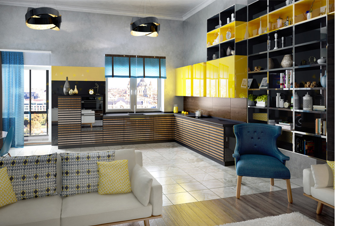 Чтобы компенсировать лаконичность форм, гарнитуры в стиле модерн зачастую выполняют в ярких расцветках: красной, сиреневой, салатовой, бирюзовой, золотой. Популярностью пользуется мебель «хамелеон», фасады которой меняют цвет в зависимости от внешнего освещения, или гарнитуры с оригинальной фотопечатью.