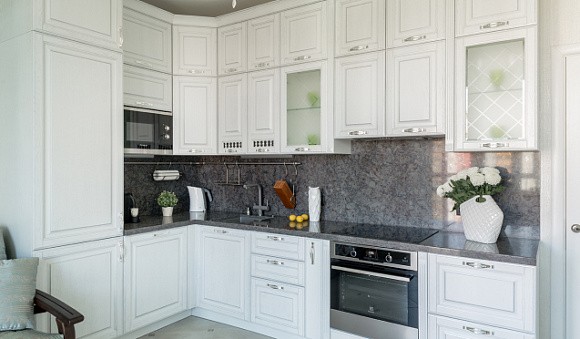К светлой мебели можно подобрать рабочую поверхность и кухонный фартук в любых расцветках и фактурах. Очень часто используются контрастные версии. Например, коричневого, черного или серого цвета.