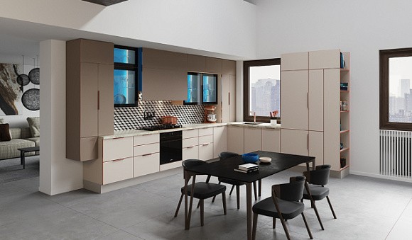 Одним из наиболее удачных является сочетание белого и бежевого. Этот вариант широко используется в небольших помещениях, в которых важно сохранить свет и воздушность. В бежевом цвете обычно выполняют столешницу, фартук и открытые полки, а вот фасады оставляют белыми.