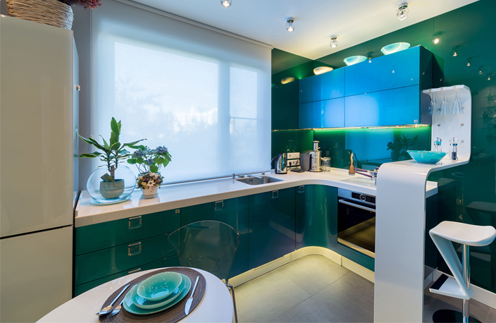 Во-вторых, угловая конструкция гарнитура естественным образом разграничивает пространство. В одном углу кухни гарнитур образует так называемую рабочую область: в ней находится эргономичный треугольник, состоящий из мойки, варочной панели и холодильника. Здесь же в кухонных шкафчиках размещаются специи, посуда и прочие необходимые для приготовления пищи принадлежности. Хозяйке не нужно делать лишних движений, чтобы достать нужную вещь, ей достаточно просто протянуть руку.