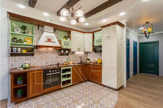 Вечная классика — массив натурального дерева. Оно смотрится дорого, обгоняет по практичности и износостойкости остальные материалы. При этом гарнитур может быть отнюдь не только классическим. Дерево удачно сочетается и с другими типами материалов, давая возможность экспериментировать со стилем.