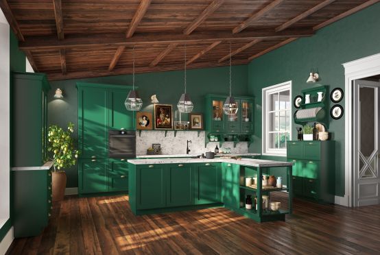 Пожалуй, самыми нейтральными из темных являются зеленые кухни, в которых темный цвет уравновешивается восприятием зеленого как наиболее позитивного природного оттенка, способствующего комфортным ощущениям.