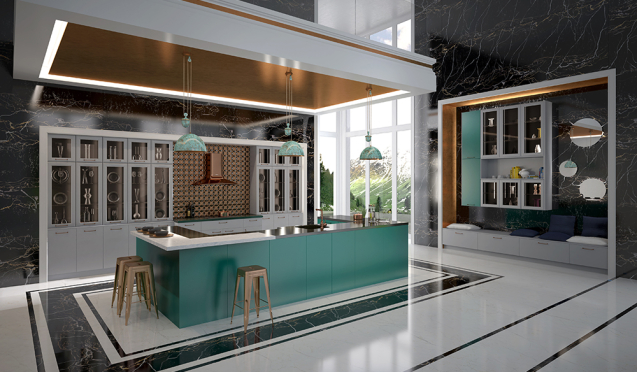 Современные производители выпускают кухни на заказ в разных стилях, поэтому подобрать нужный вариант можно для любого пространства. Например, для помещения больших размеров с высокими потолками подойдет классическая зеленая кухня. Подобные гарнитуры обычно выполняют в изумрудных, малахитовых, коричнево-зеленых тонах. Для их декоративного оформления используют резные узоры, лепнину, позолоту, патину.