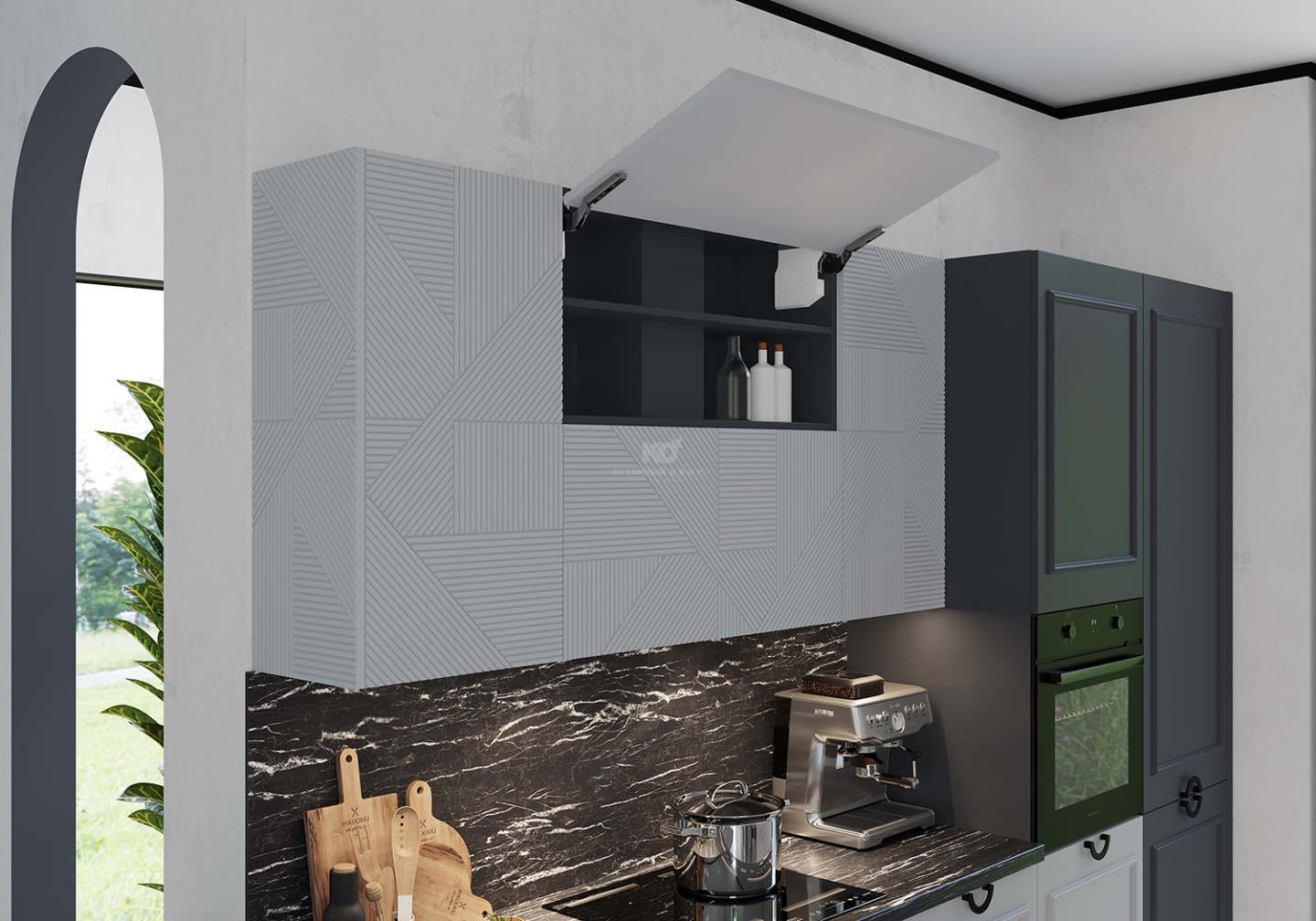 «Астрид» доступны два типа фасадов: первый покрыт художественной фрезеровкой, второй же имеет декоративные молдинги, выложенные в строгие прямоугольники. Оба типа фасадов создаются из МДФ и покрываются высококачественной экомембраной. Такое покрытие надёжно защищает поверхности от влаги, перепада температур и УФ-лучей, а также годами сохраняет первозданный цвет. Очень практичное решение для современной кухни!
