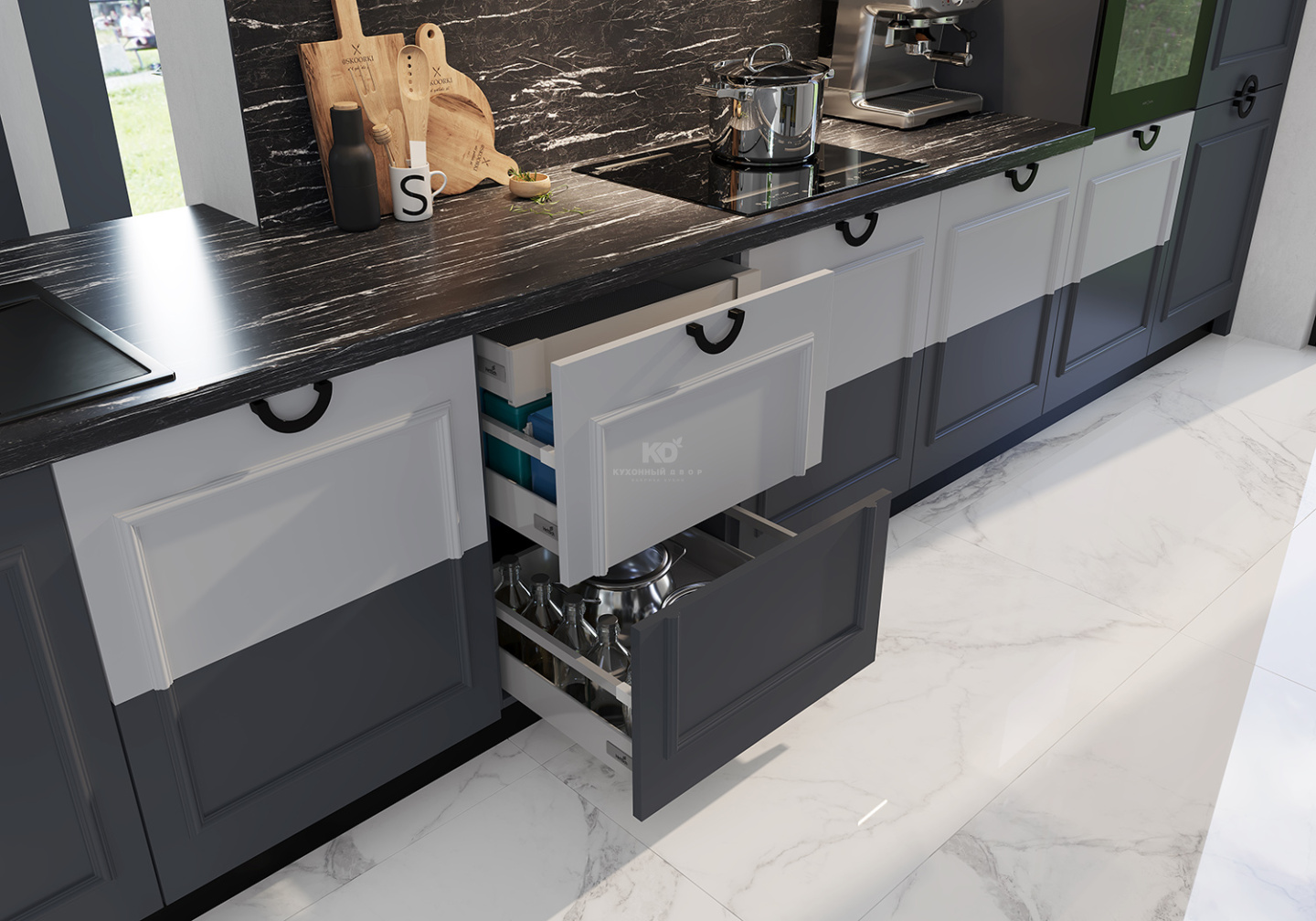 Обращаем Ваше внимание, что цена за погонный метр включает в себя: фасады выбранной категории, влагостойкую столешницу HPL (Германия) высокой прочности, корпуса ЛДСП Egger (Германия) с кромкой ABS, ящики с доводчиками , петли с доводчиками, ручки, алюминиевый поддон в стол под мойку, сушка (Италия), цоколь Volpato (Италия). Из расчета в размере 2400 мм.