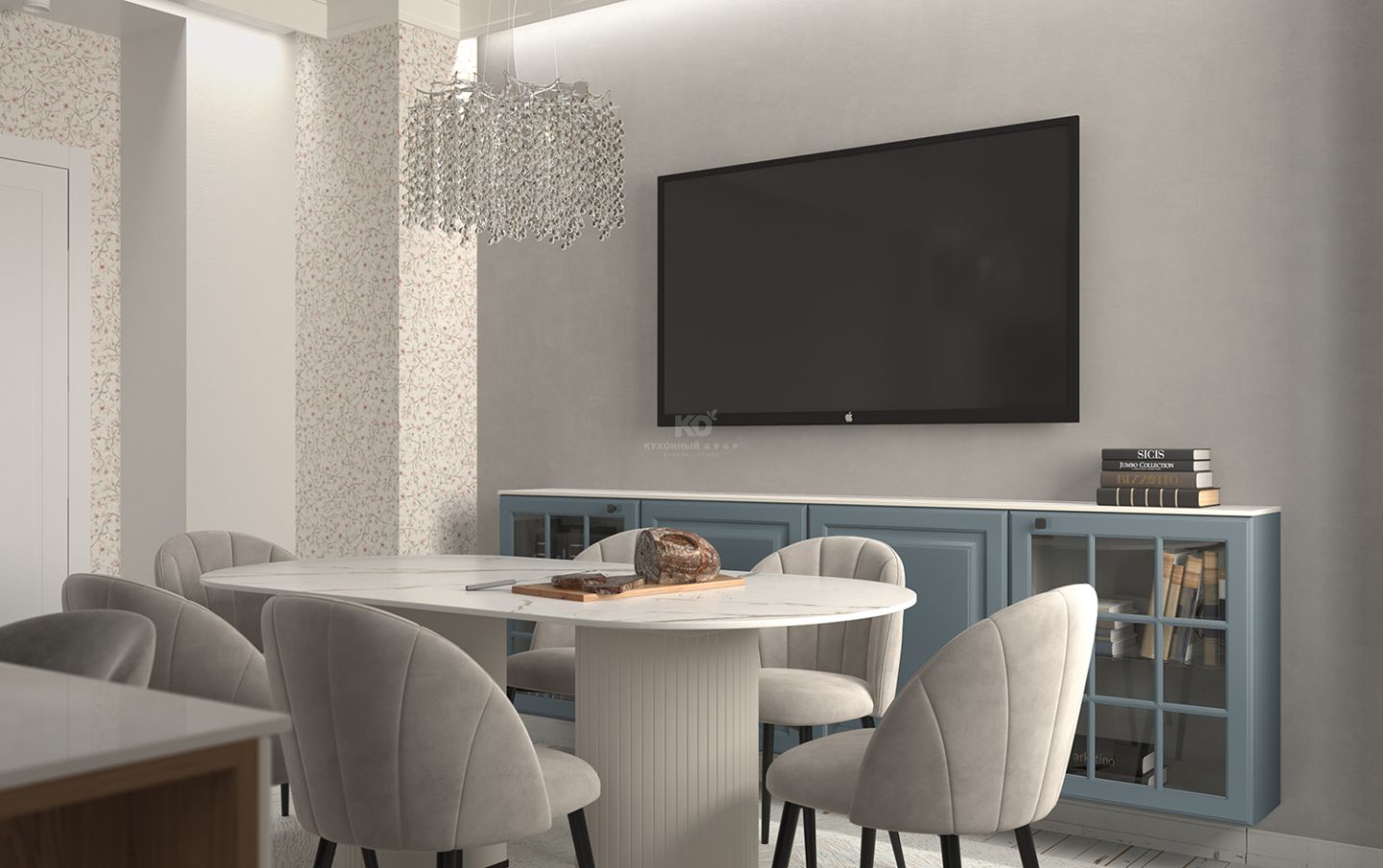 Центральная часть кухни — большая рабочая зона, идеальное поле для воплощения ваших кулинарных идей. Здесь же расположена варочная поверхность, а над ней — две интегрированные вытяжки, которые эффективно справляются с удалением запахов. Чтобы ничто не помешало медленным воскресным завтракам или камерным ужинам за большим островом. Он становится доминантой дизайна и символом гостеприимства, создавая атмосферу современного европейского салона, где кухня и гостиная сливаются в единое пространство.