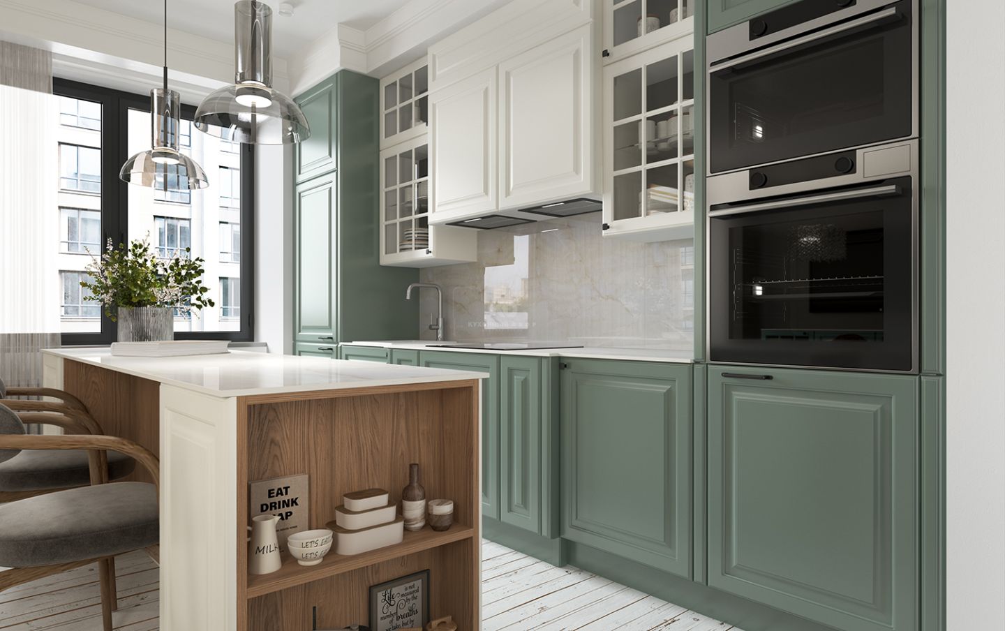 По краям кухня Катарина обрамлена двумя колоннами оттенка полыни — мягкого, спокойного цвета, который подчёркивает её статус и гармонию. Слева — встроенный холодильник, справа — интегрированный духовой шкаф и СВЧ-печь. Такое расположение помогает сохранить симметрию, а также обеспечивает эргономичность и удобство использования.
