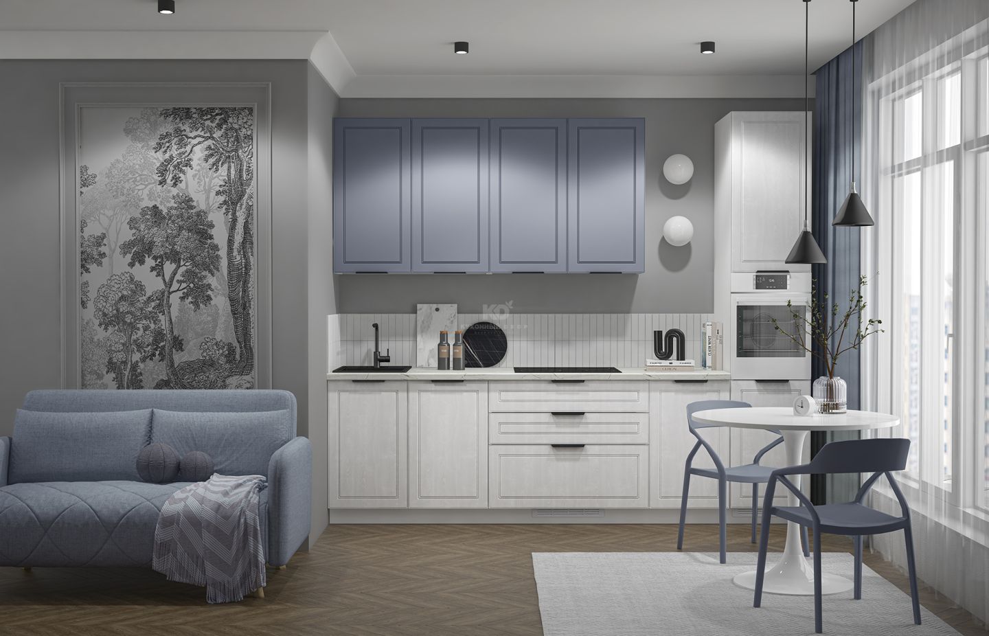 Фасады Леи изготовлены из МДФ, покрытой экомембраной в технологии 3D-окутывания без кромок, что обеспечивает устойчивость к механическим повреждениям и долговечность. Они приятны на ощупь и придают интерьеру благородный, сдержанный вид. В комплектацию входят все необходимые элементы, включая столешницу, фурнитуру и пеналы для встроенной техники. Итог — чистота линий и максимум полезного пространства при визуальной компактности.