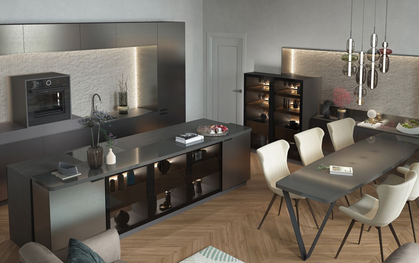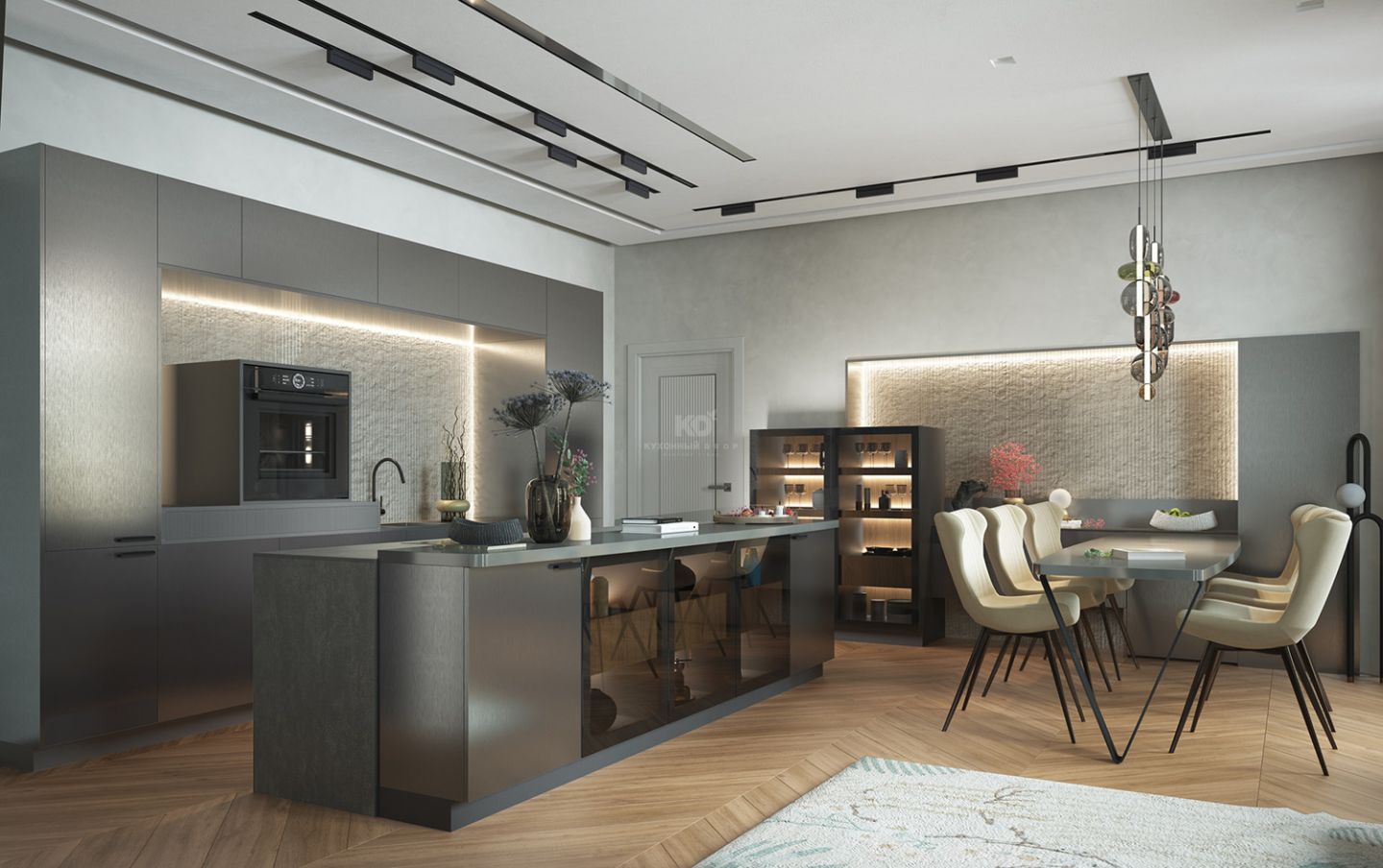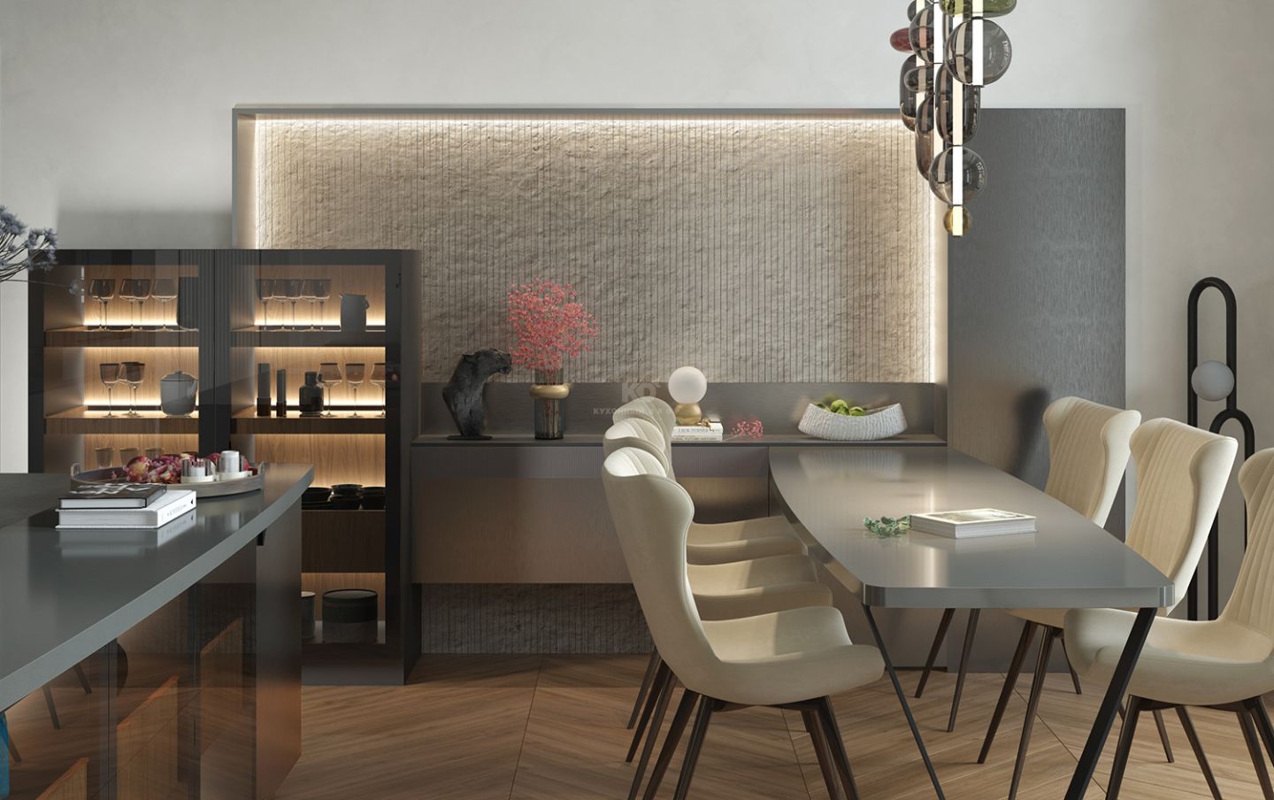 Дизайн не обрывается на рабочей зоне. У дальней стены композицию продолжает еще одна витрина, соединенная с парящей подвесной тумбой. Эта линия логично завершается обеденной группой, создавая единый ансамбль, где каждая деталь — от фактуры МДФ до теплого свечения в витринах работает на образ интеллектуального и чувственного минимализма.