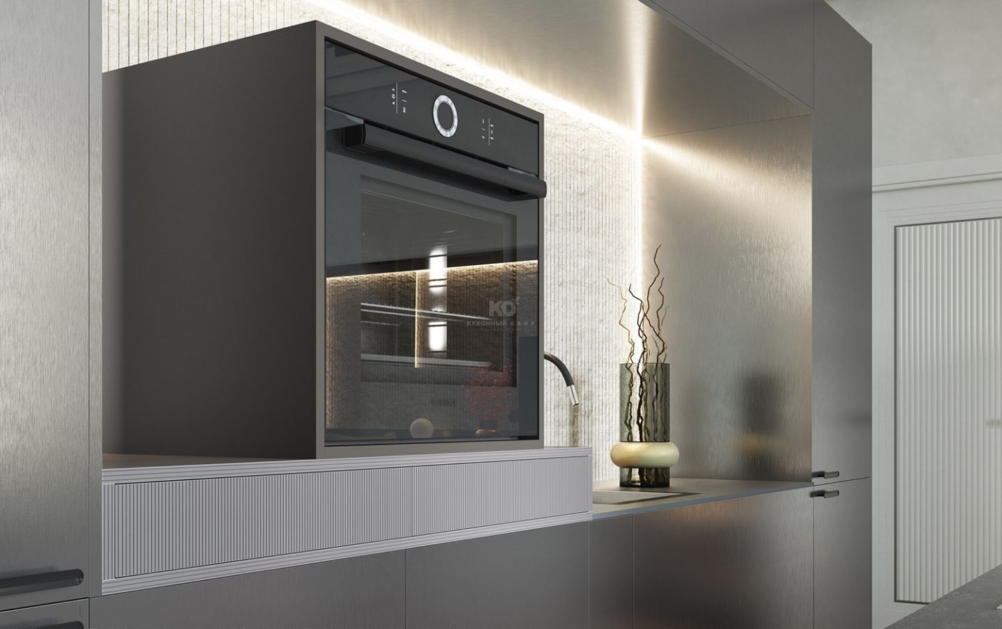 Концептуальный подиум: в зоне мойки расположено необычное решение — духовой шкаф, установленный на подиум с изысканной фрезеровкой. Это не только визуальный акцент, но и практичный ход: слева от духовки образовалась уютная ниша. Это идеальное место для кофемашины, где утренний ритуал превращается в эстетическое удовольствие.