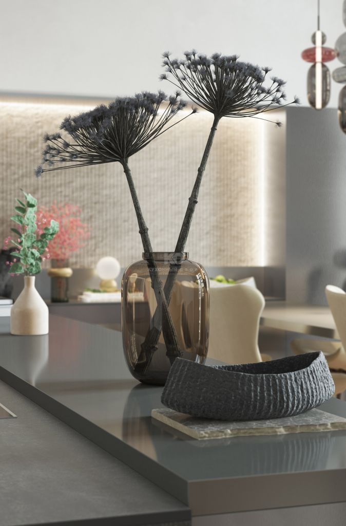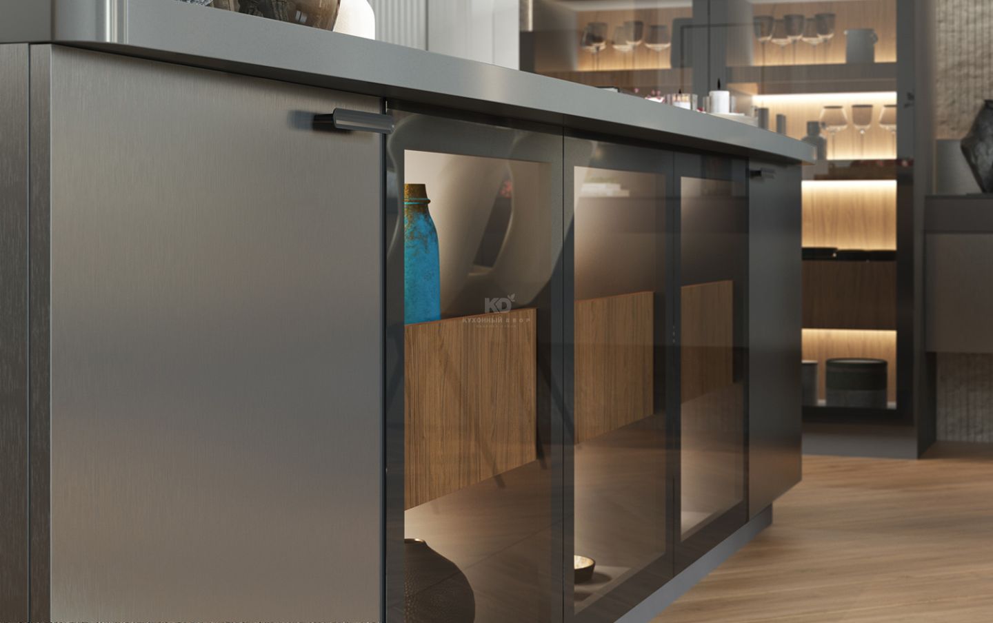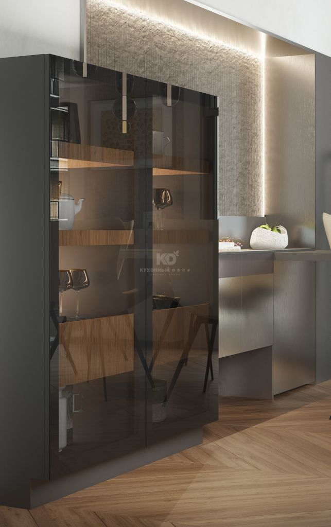 Свет в витринах не просто освещает содержимое, он создает глубину и интригу. Сквозь тонированное стекло очертания посуды кажутся зыбкими и таинственными, превращая обыденные предметы в экспонаты частной галереи. Это кухня для тех, кто ценит паузы между словами и находит красоту в игре теней на матовом металле.